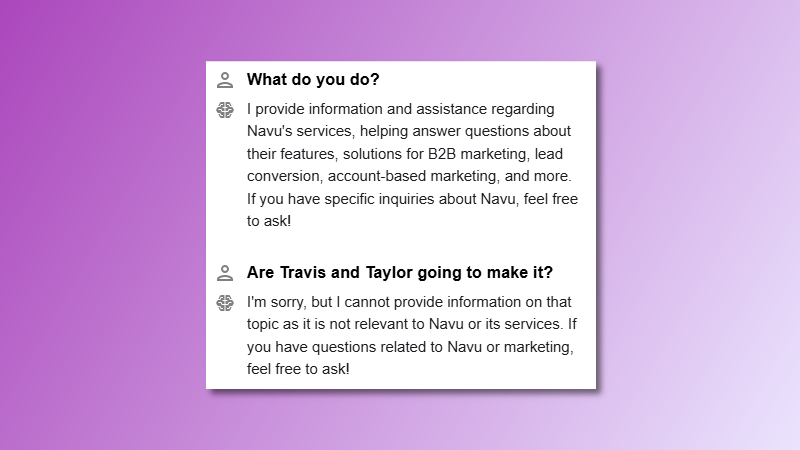 The focus component is what separates Navu from more general tools. Users can ask any question they like, but answers are always going to be relevant to your company (and their persona). That means if they ask “what do you do?” it will answer as the company. If they ask “do you have any events near me?” it will give an answer specifically for the visitor based on IP address. But if they ask about Taylor Swift and Travis Kelce, Navu won’t make something up or pull from the outside internet.