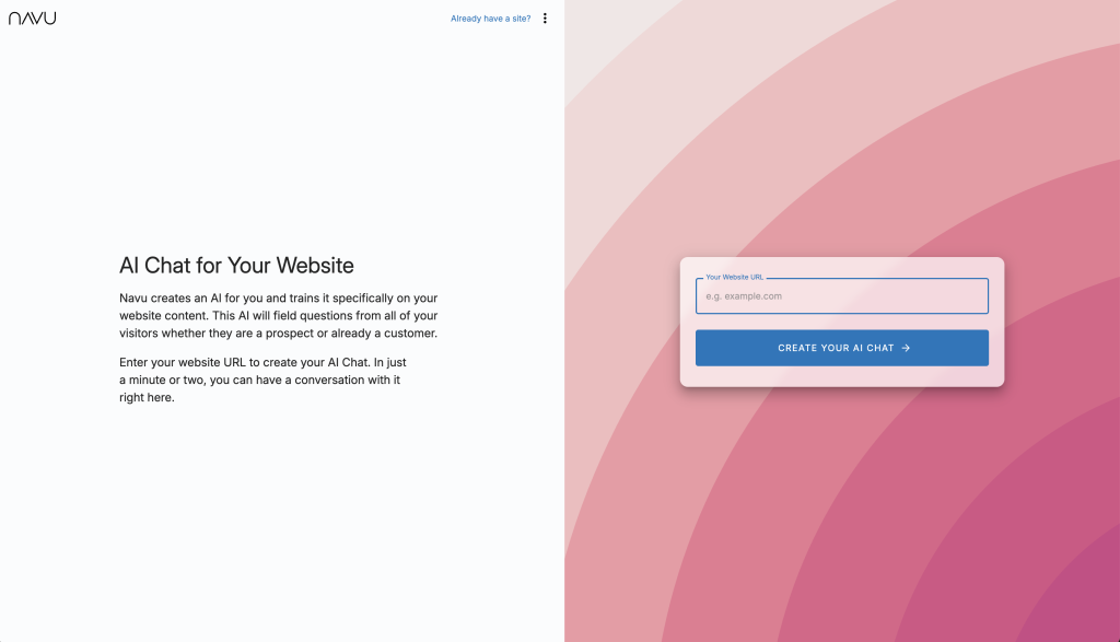 Go to https://app.navu.co/setup/ and enter your website’s URL. When prompted, enter your email address to create your Navu AI.
