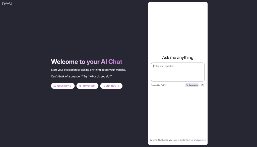At any point during the evaluation you can install Navu on your website and publish the Sidebar to a subset or all of your visitors, depending on how you wish to manage its introduction. As you collect more information about your visitor’s journeys and the conversations they are having in the AI Chat, the analytics Navu provides will offer more and more insights into your visitors.