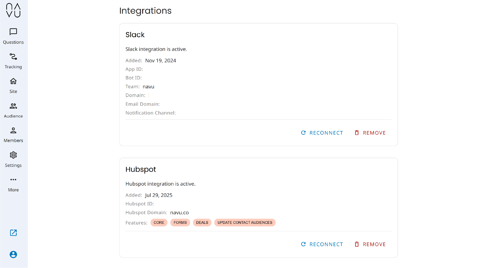 In the Navu portal, navigate to the Integrations Page. This can be found in the lefthand navigation nested under ‘More’. While there, you can see active integrations, including with HubSpot, and click on ‘Remove’ to disconnect immediately. No new data will be synced, but you may still see previously synced data in both Navu and HubSpot.
