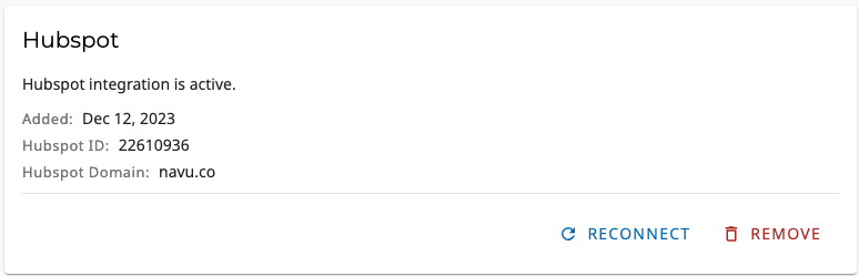 Note, you may need to check with your HubSpot administrator if you don’t have the account permissions necessary to enable this integration. Once enabled, the HubSpot card in the Navu Integrations Tab will show the HubSpot integration is active.