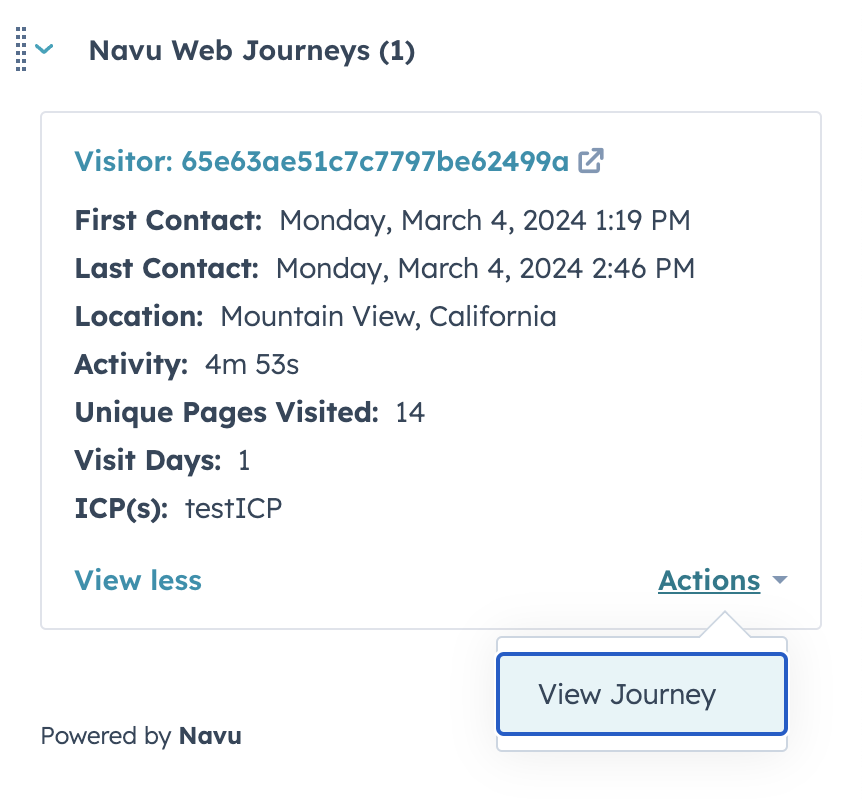 The integration automatically creates a new CRM Card for the Contact record. This card is populated by calling back to Navu. If there is anything wrong with those callbacks, an error message is displayed in that card. There is one card for up to 5 recent visitors based on matching the email address of the contact with the identity of the Navu visitor. The card shows: