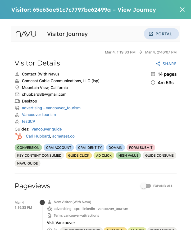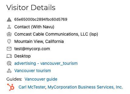 The integration allows Navu to augment visitor information based on HubSpot data by highlighting the HubSpot contact information in the Navu visitor details.