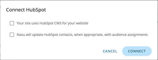 This will lead you through a connection sequence to connect your HubSpot account to your Navu account. On the first dialog, always check the second box. If your website uses HubSpot as the CMS, then also check the second box.