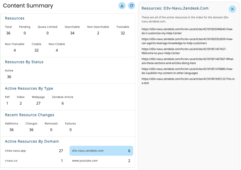 On the Content tab you will now see your Zendesk subdomain listed under Active Resources By Domain. Clicking on it will show the list of resources Navu has ingested to the right. After enabling the integration, it will take a few minutes for this list to be complete. From that point on, Navu will automatically detect changes in the Zendesk content and update accordingly.
