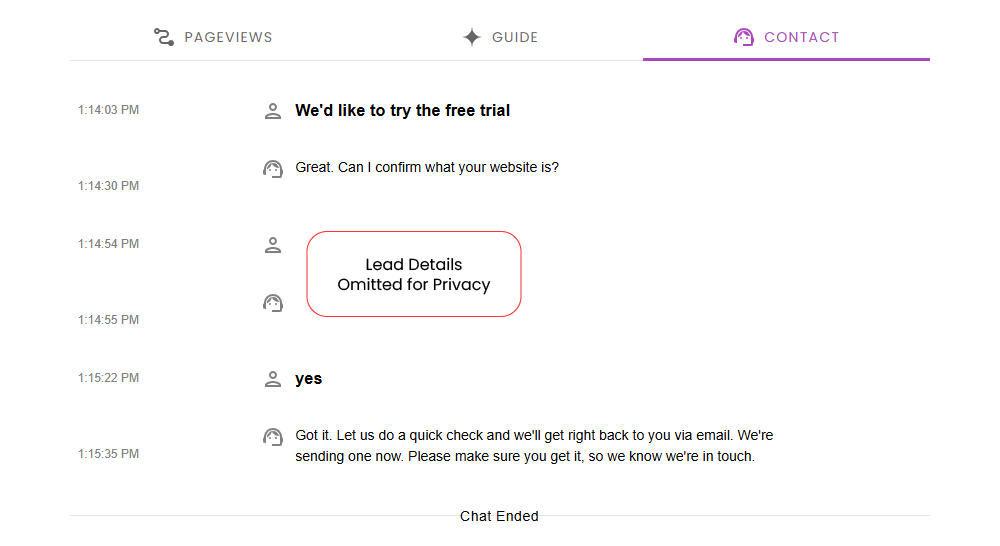Normally in the Sidebar Spotlight series, we move straight through to talk about the conversation the AI. But in this case, after asking browsing five pages and asking five questions, this visitor immediately started a chat with a live agent to request a free trial: