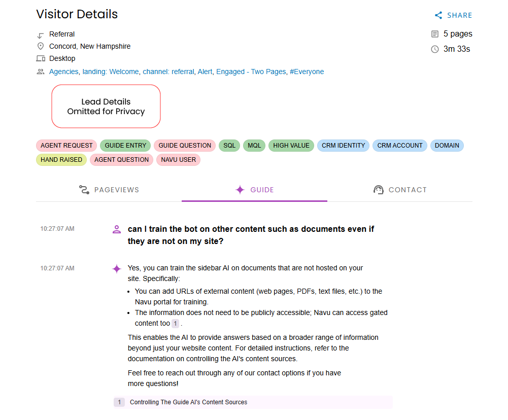 This lead came to Navu as a referral, and in a single session went from first touch to requesting a trial. But that doesn’t mean it was easy — they browsed five pages, asked five questions to the sidebar, and even chatted live with a representative!
