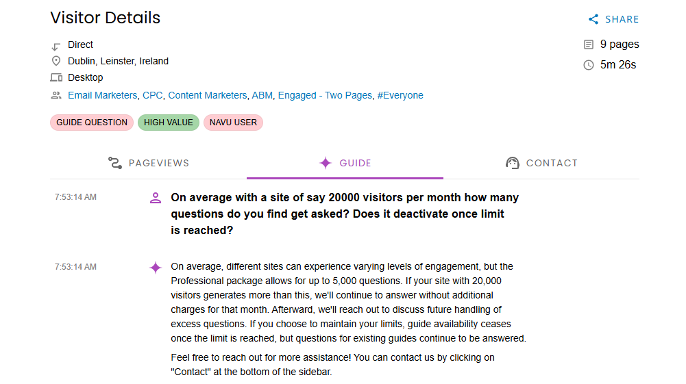 Navu Answer: “On average, different sites can experience varying levels of engagement, but the Professional package allows for up to 5,000 questions. If your site with 20,000 visitors generates more than this, we’ll continue to answer without additional charges for that month. Afterward, we’ll reach out to discuss future handling of excess questions. If you choose to maintain your limits, guide availability ceases once the limit is reached, but questions for existing guides continue to be answered.”