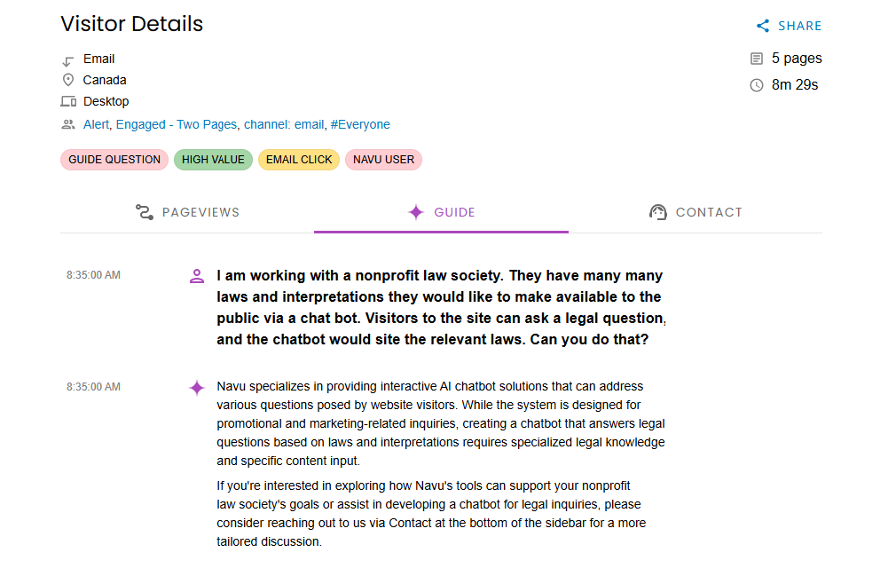 Navu Answer: “Navu specializes in providing interactive AI chatbot solutions that can address various questions posed by website visitors. While the system is designed for promotional and marketing-related inquiries, creating a chatbot that answers legal questions based on laws and interpretations requires specialized legal knowledge and specific content input.