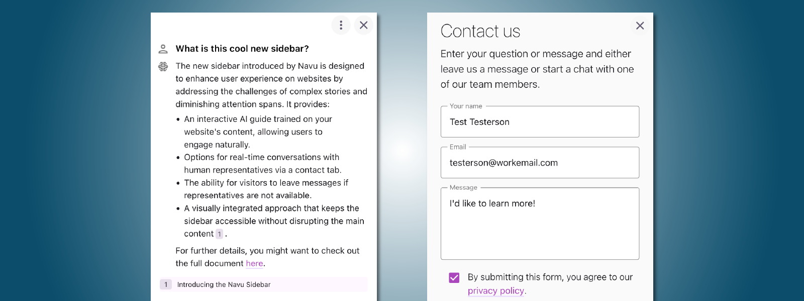The Navu Sidebar is the best way to enhance your website with AI. It seamlessly adds a smart, conversational chat interface that keeps visitors engaged, answers their questions in real time, and guides them toward actions that drive conversions.